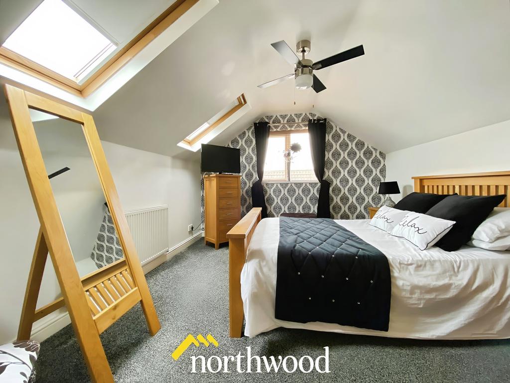 Back facing velux, fitted cupboard, towel radiator, bath, toilet and sink unit, shaving point, tiled wet areas.