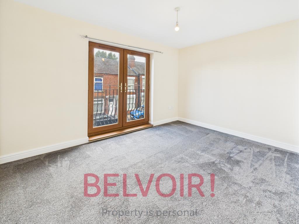 A spacious double bedroom at the front of the property with double French doors opening to a Juliet balcony, allowing fresh air and natural light to flood the room. Includes a handy over-stairs storage cupboard and plenty of space for bedroom furniture.