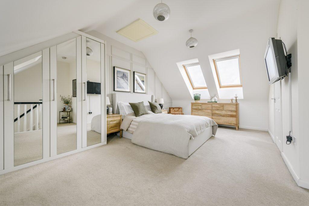 An exceptionally large master bedroom, the wall behind the bed has wooden panelling and there are built in wardrobes, a window to the front of the property and two Velux windows to the rear. A doorway leading to En-Suite