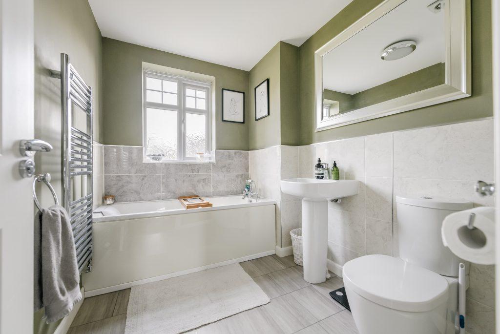 Having a panelled bath, wash basin and low level W.C. The floor is tiled and the walls are half tiled. There is a chrome heated towel rail and an extractor fan.