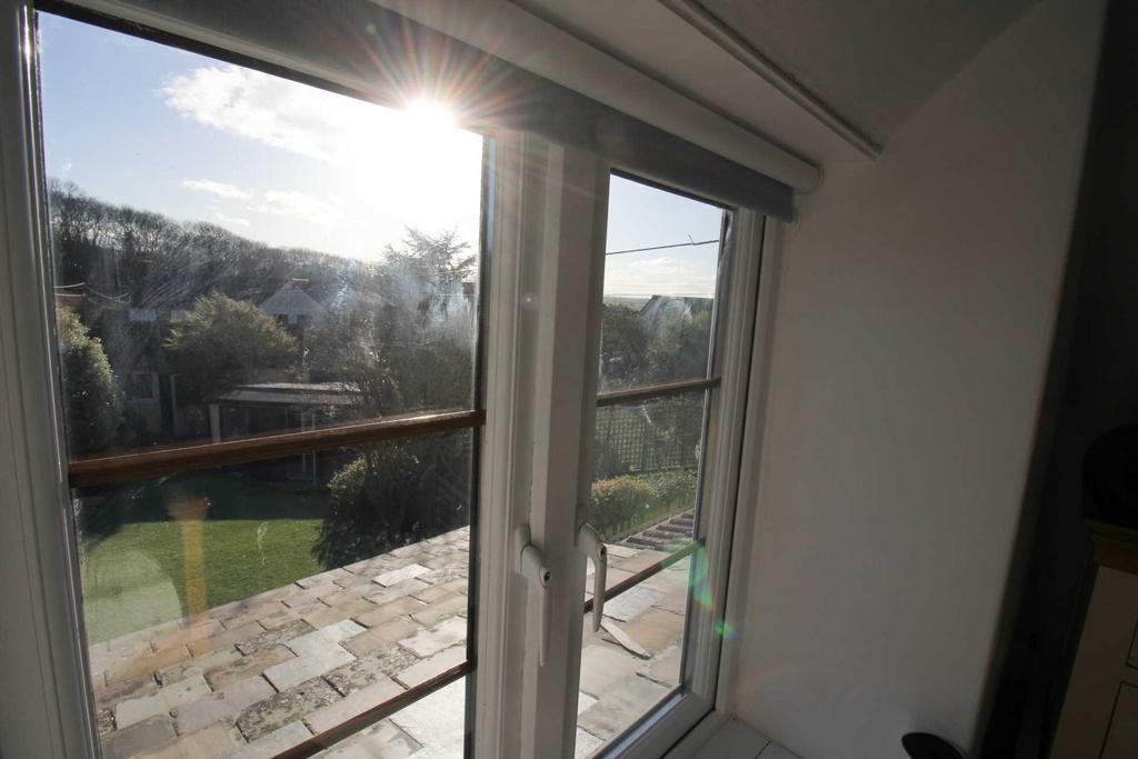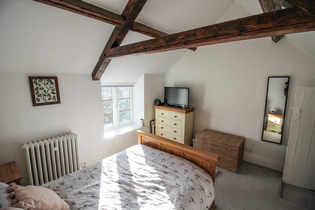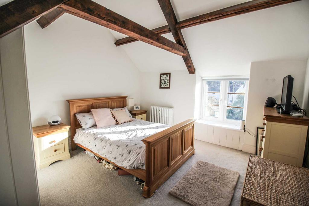 Front aspect high level double glazed wood framed window with window seat with storage below. high level ceiling with exposed 'A' frame. Built in wardrobes. Feature cast iron radiator. This room offers wonderful views to the front.