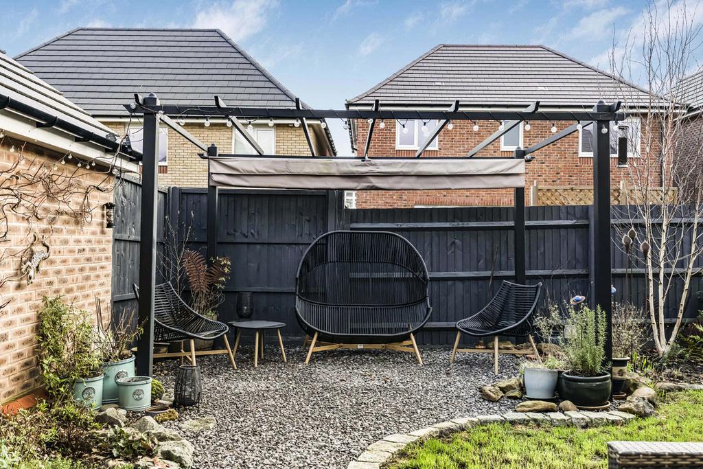 Outside, to the front is a detached, single garage with a pitched roof for storage. The garage also has electrical connection. In front of the garage are off road parking spaces. To the rear is a lawned garden, with a fitted pergola towards the back.