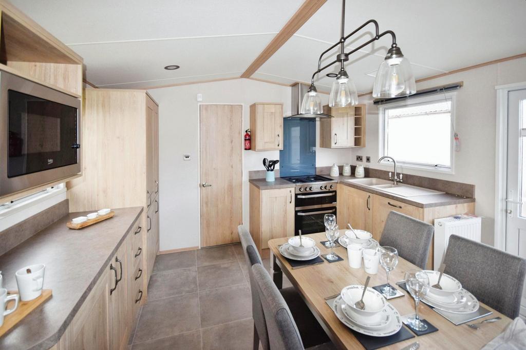 Entered via a UPVC side entrance door into Kitchen area, which comprises, range of base, wall, drawer and ladder cupboards, integrated double gas oven and hob, extractor over, integrated fridge freezer, integrated dishwasher, integrated washing machine, integrated microwave, UPVC French doors to the deck with lake views, vertical radiator, electric fire and surround, three seater sofa and two seater sofa bed.