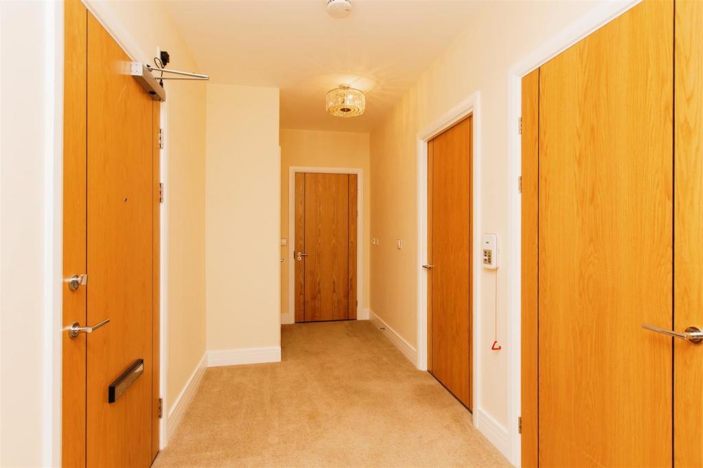 Welcoming hallway accessed via a solid oak door with spy hole and letter box. Equipped with a security entry system, emergency intercom, and mains-wired smoke detector. Two spacious storage cupboards and doors leading to all rooms.
