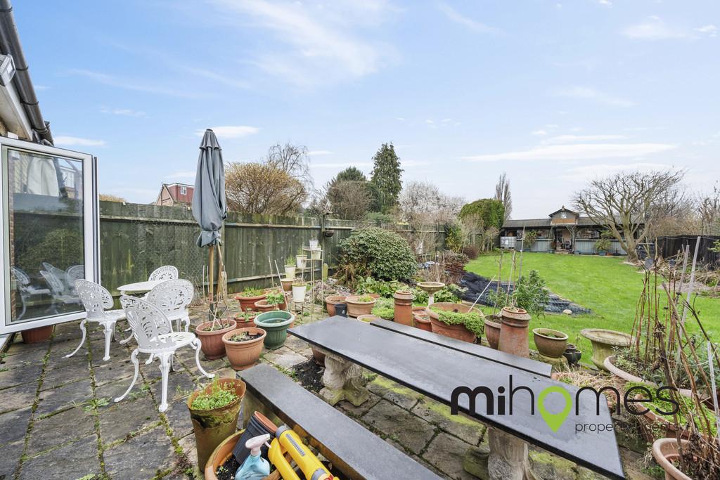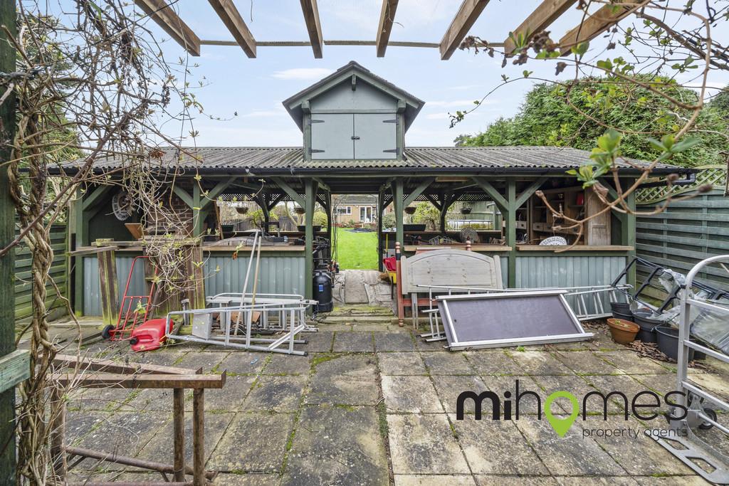 Accessed through an additional door, the expansive garden offers a large patio area, ideal for outdoor seating, along with a well-maintained lawn, mature trees, and fencing. A spacious outbuilding, featuring a covered garden area and ample storage, further enhances the outdoor experience.