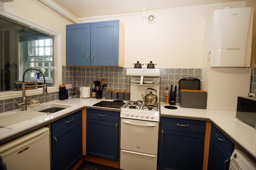 Inset sink and drainer. Modern base cupboards with laminate worksurface. Matching wall cupboards. Free standing double oven with gas hob. Automatic washing machine. Wall mounted 'Ideal' gas combination boiler. Low level 'fridge. Inset spotlights.