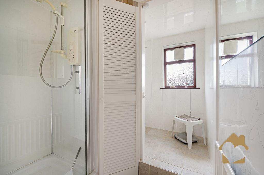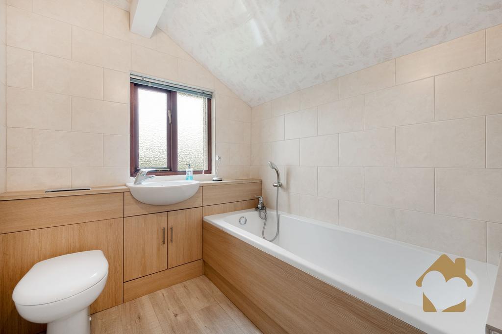 The family bathroom is complete with a washbasin, WC, and a bath featuring a convenient shower wand. The room is adorned with a heated chrome towel rail, electric underfloor heating, an opaque window to the side elevation, and a handy ledge for toiletries, combining functionality with aesthetics.