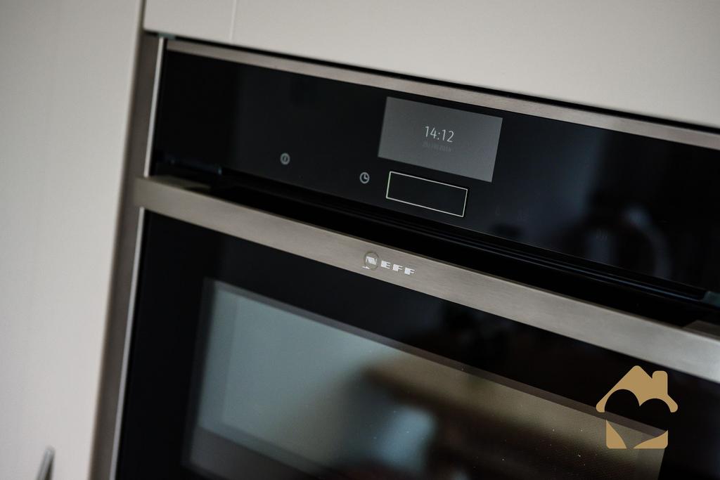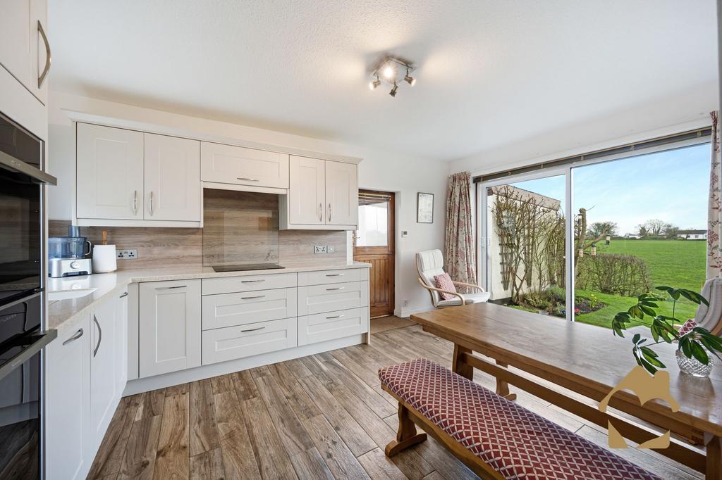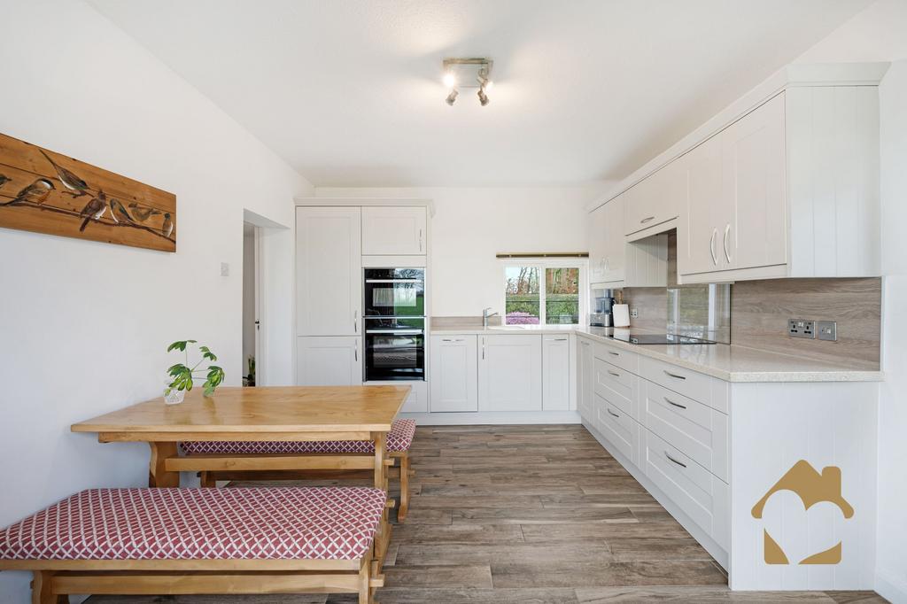 Adjacent to the living room, the dining room stands as another sizable area adaptable to various purposes. Illuminated by windows on both side elevations, the room features electric sockets, radiators, and ample space for versatile furnishings. A subtle elevation change leads to a well-designed kitchen, while a door grants access to the downstairs WC and shower room. The shower room, a practical addition, houses a washbasin, a WC, and a shower, with thoughtful storage in the form of a floor-to-ceiling cupboard. Tastefully fitted in recent years, the kitchen seamlessly combines style and functionality. It includes a slimline dishwasher, fridge-freezer, Neff induction hob, extractor fan, Neff microwave oven, and Neff electric oven-all integrated for convenience. The kitchen enjoys an abundance of natural light through windows on the front and rear elevations, along with a side patio door. The space accommodates a dining table and occasional chairs, offering a delightful spot to admire the morning or evening views through the sliding doors. Inspired by the vendors' experiences in France, wood-effect tiles add charm, and electric underfloor heating completes the modern and welcoming atmosphere of this thoughtfully designed kitchen.