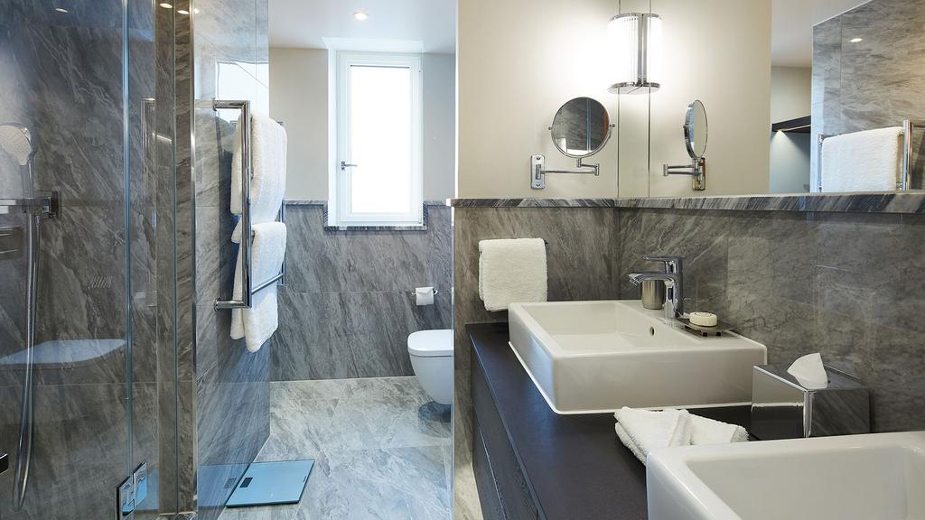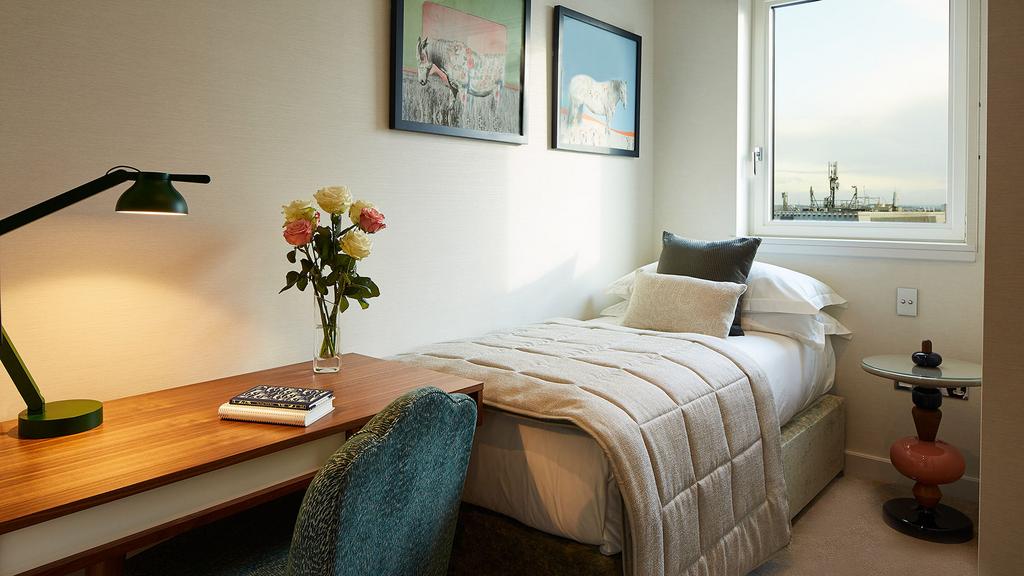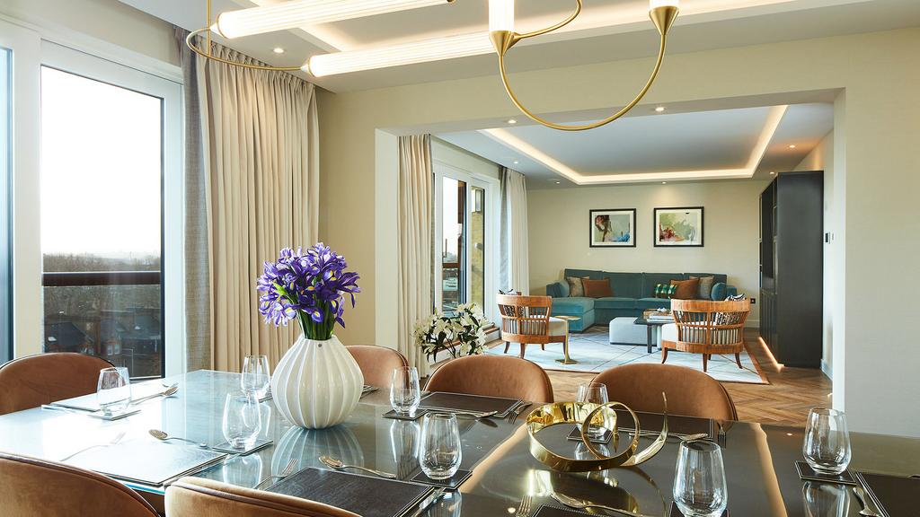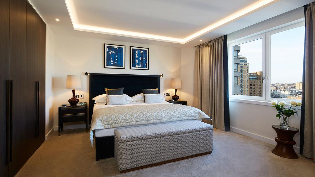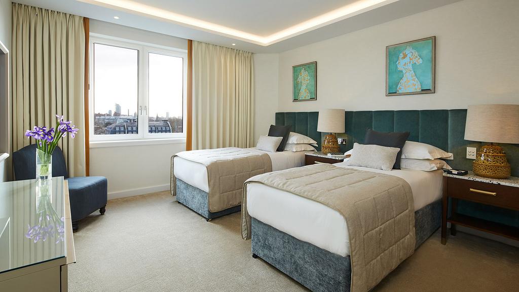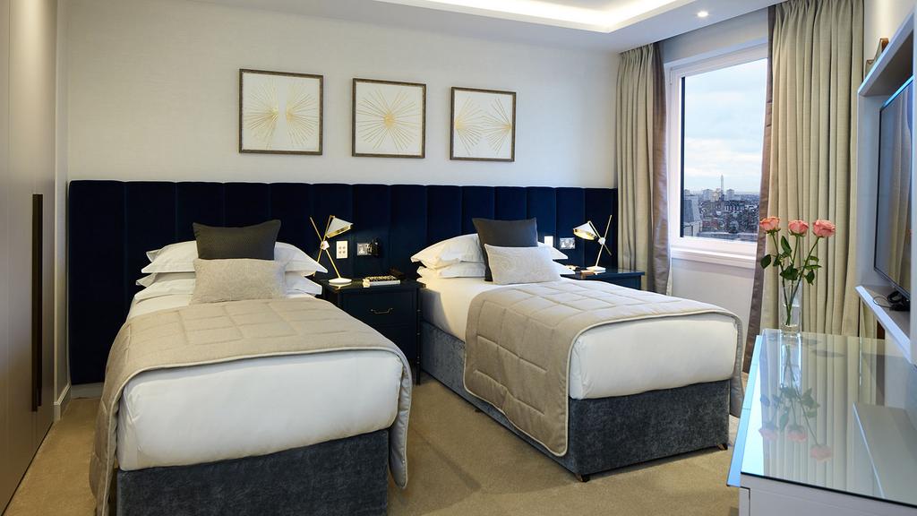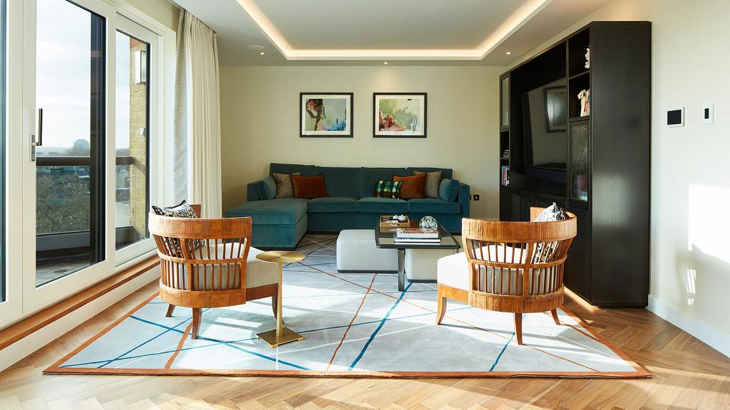 The generously spacious en-suite master bedroom houses a king-size bed along with plenty of storage space for your convenience. The second en-suite bedroom also features a king size bed and a balcony overlooking scenic London views. Two further en-suite twin rooms lie on the opposing side of the apartment as well as an additional single bedroom – all bathrooms are supplied with L’Occitane toiletries and luxury amenities to enhance your stay.