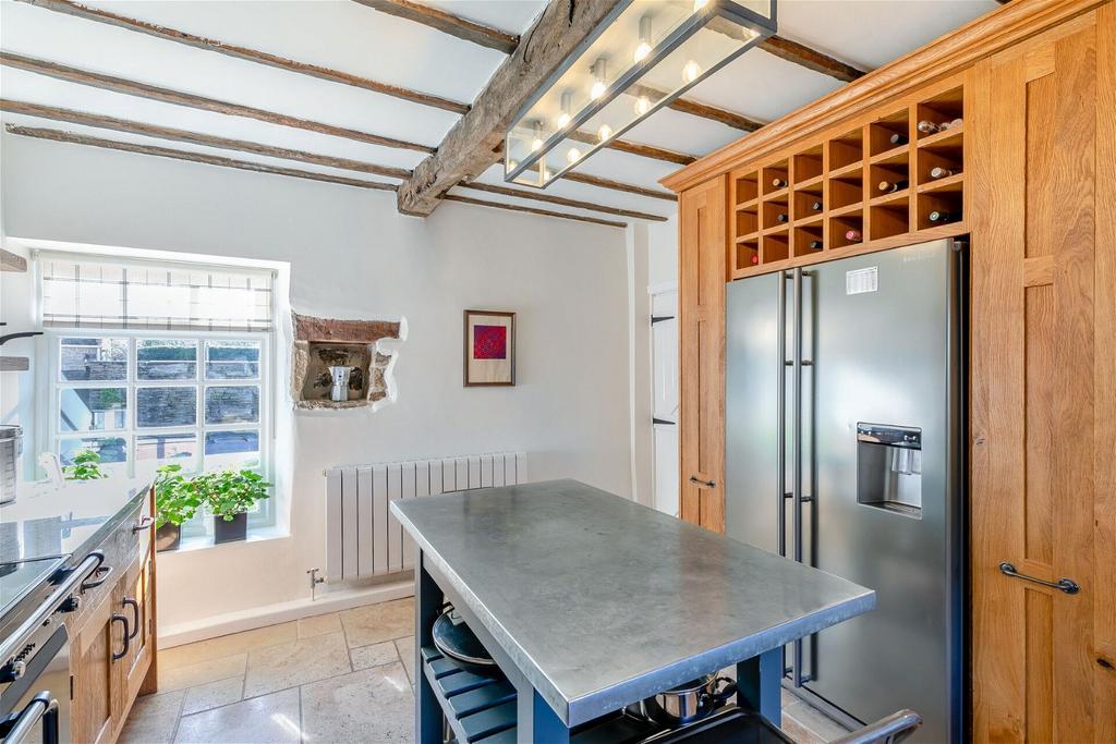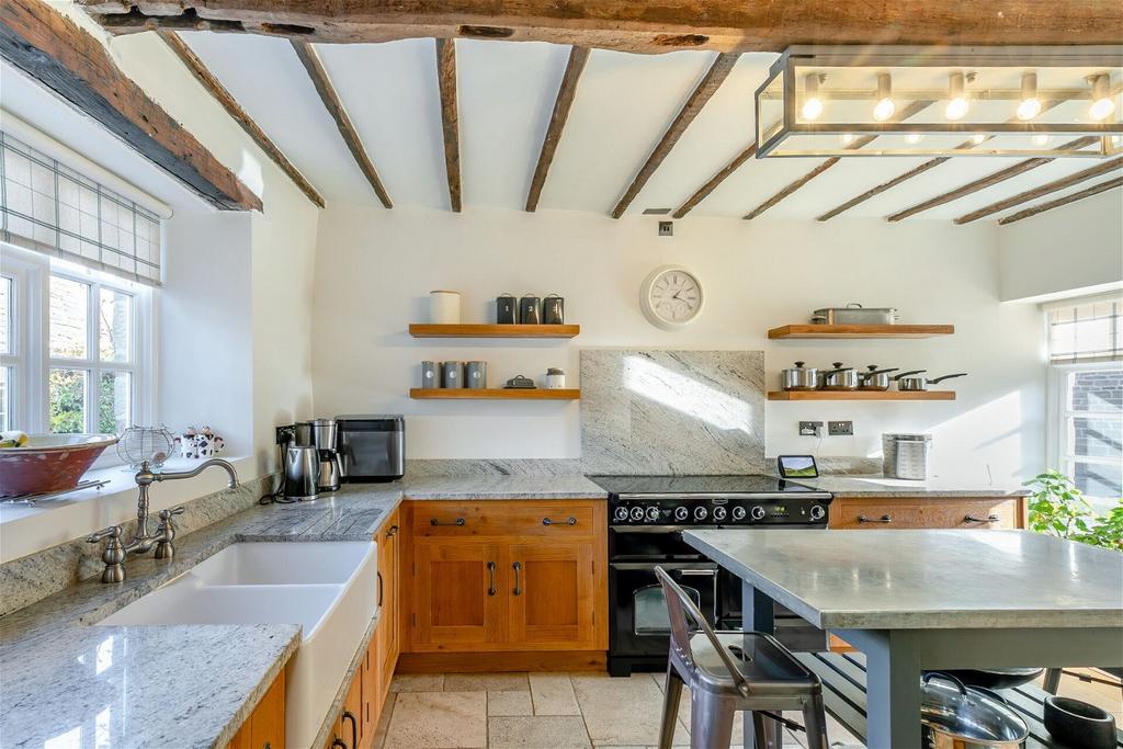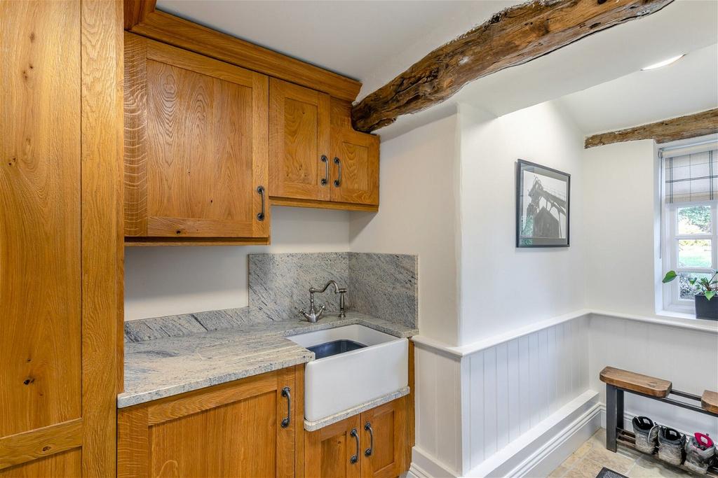 The kitchen has windows to both front and rear aspects, the rear commanding a delightful outlook over the gardens, the room retaining exposed beams to the ceiling and a continuation of the floor. The kitchen is bespoke, and hand made by local craftsmen, Love Wood Kitchens, with solid oak furniture consisting of base cupboards, with a granite work surface over and matching up-stands, with an inset drainer and a double bowl Belfast sink with a mixer tap. There is space for a double width electric range cooker with a granite splash back, a dishwasher and space for a Larder style fridge freezer. There is access through to the adjoining utility / boot room, which has a continuation of the travertine floor. There is a composite door opening directly onto a flagged terrace, a window to the side aspect and furniture matching the kitchen, with a granite work surface, a butler sink and an integral automatic washing machine.