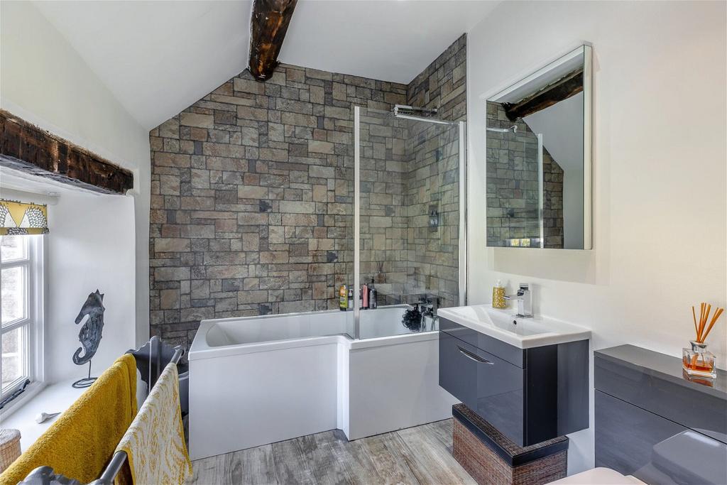 The family bathroom is presented with a modern suite finished in white, comprising a wash hand basin with a drawer beneath, a low flush W.C and a P-shaped bath with a shower over and a ceramic tiled stone-effect surround. A window set to a stone mullioned surround overlooks the garden.