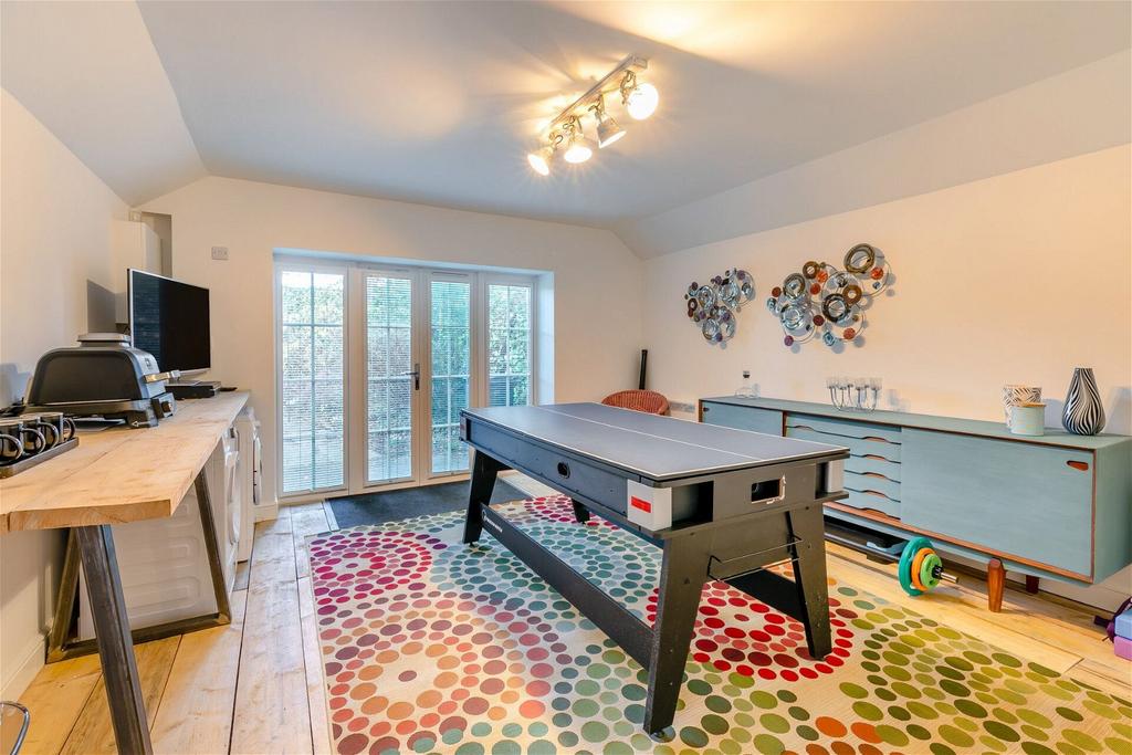 The annexed accommodation is separated from the main house by a stone flagged terrace patio and offers flexible accommodation to include leisure, a guest bedroom suite or with slight configuration offers the potential to create self-contained semi-independent accommodation for teenagers or elderly relatives. French doors open directly into a generous living space, which offers versatile accommodation, has exposed floorboards and has access to through to the bedroom, which once again has exposed floorboards and offers generous double bedroom accommodation. There is a window overlooking the garden and a part glazed door to the side aspect. An internal door gains access through to the games room, which once again has exposed floorboards, French doors opening directly to the rear aspect and has plumbing for an automatic washing machine.