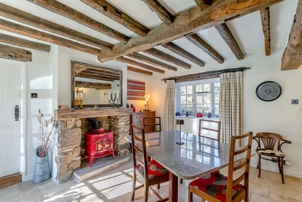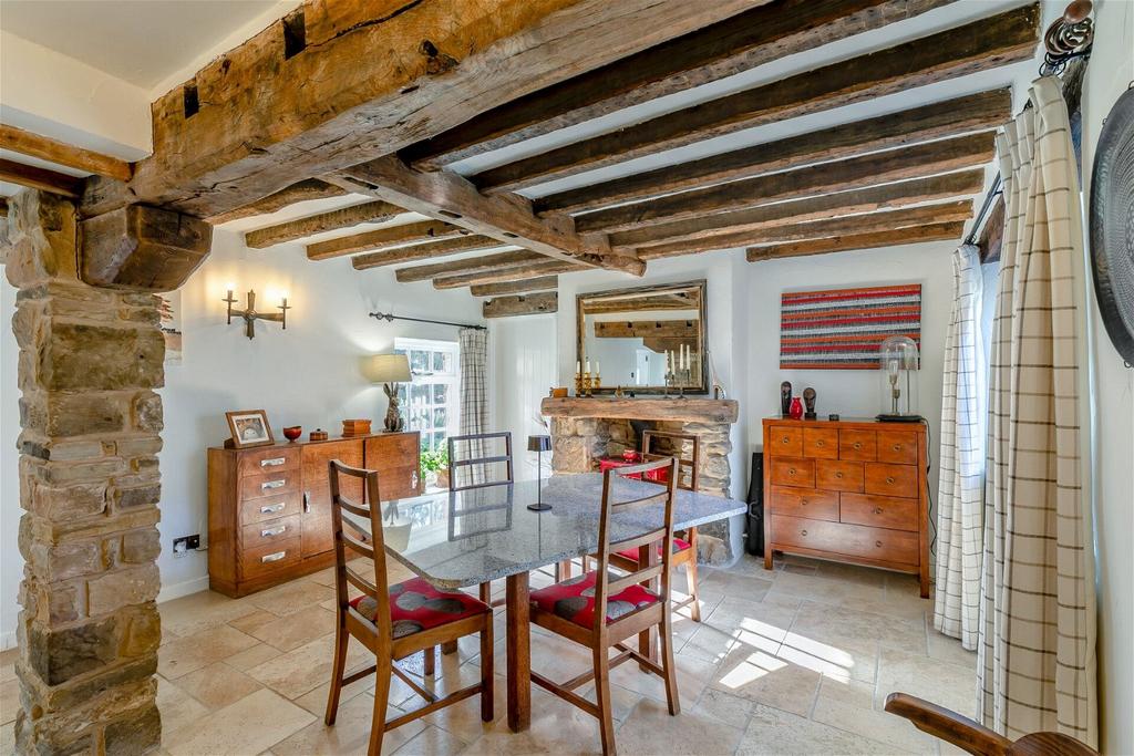The dining room has windows to both front and rear aspects, displays original timbers exposed to the ceiling, a travertine tiled floor and a gas stove that sits on a flagged hearth set back into a chimney breast with an exposed stone backcloth and beamed lintel over. From the dining room, to the rear porch, which has a door opening to the garden and access to a cloakroom that is presented with a modern two-piece suite and is also home to an oil-fired boiler.