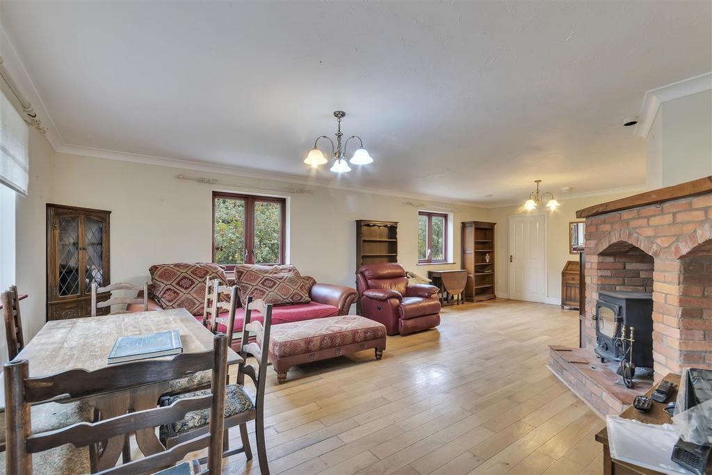 Living/Dining Room - 8.33m x 4.95m max - Continued hardwood flooring, two front and side aspect wooden frame double-glazed windows, brick-built fireplace with a quarry tile hearth. and inset log-burner.