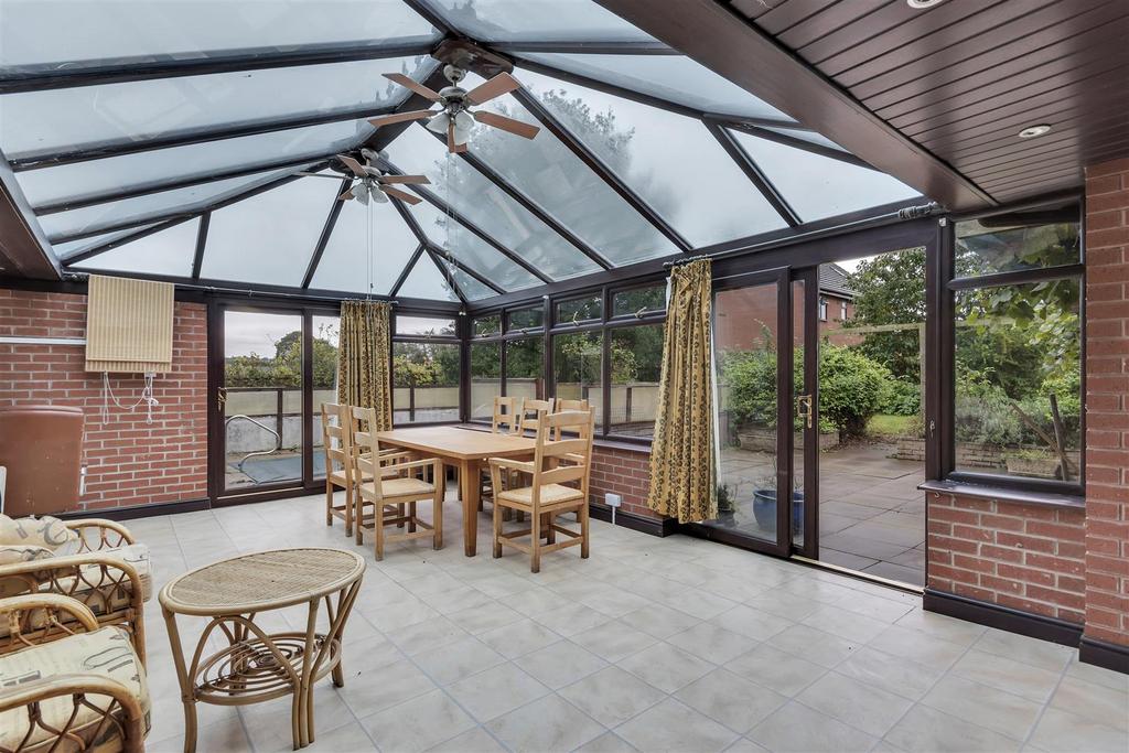 Conservatory - 4.04m x 8.69m - Brick-built uPVC double-glazed conservatory, linoleum flooring, two sets of sliding patio doors to patio and pool area, Double doors to living room, kitchen, and bedroom, ceiling fan with lighting.