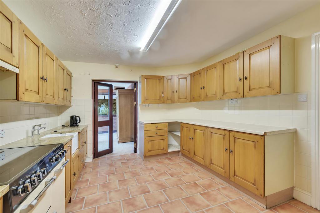 Kitchen - 3.81m x 3.28m - Linoleum floor, built-in base and wall units with a quartz worktop and sunken Belfast sink. Electric Cookmaster double oven with five-ring ceramic hob and extractor hood over, half size Neff dishwasher.