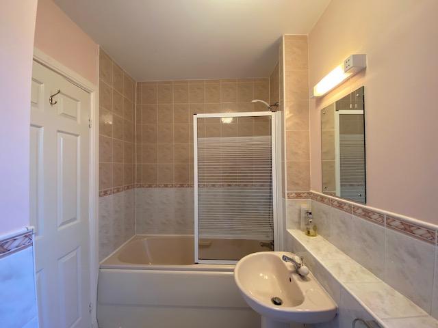 Large shower cabin, with Mira thermostatic shower. Toilet with cistern, sink with pedestal. Two towel rails, radiator, Mirror and shaving light, fan.