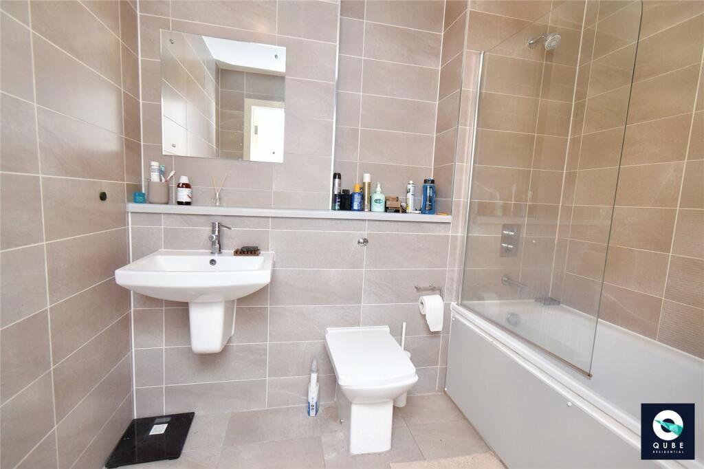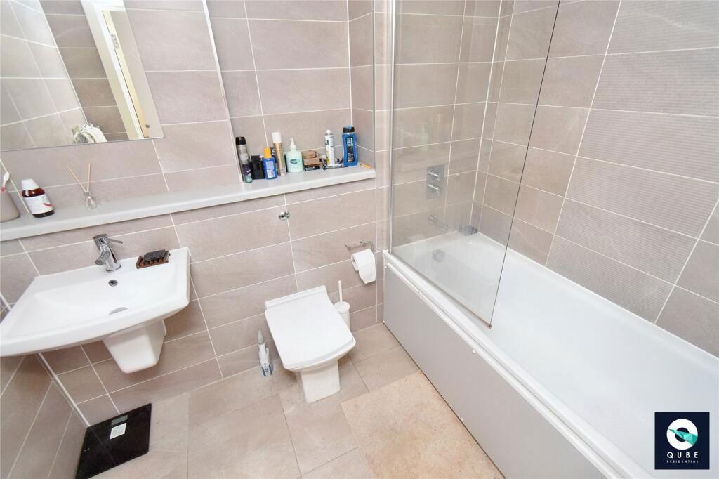 Tiled flooring, low level w/c, handwash basin, panelled bath with power 'over' shower and splashguard, chrome vertical towel warmer, recessed spotlights to ceiling, tiled to compliment.