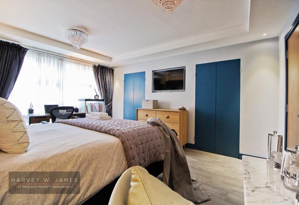 - Bedroom – 4.52m (14'10ft) X 4.85m (15’11ft) Wooden flooring, curtain, Double bed, bedside table, Bespoke fitted wardrobes