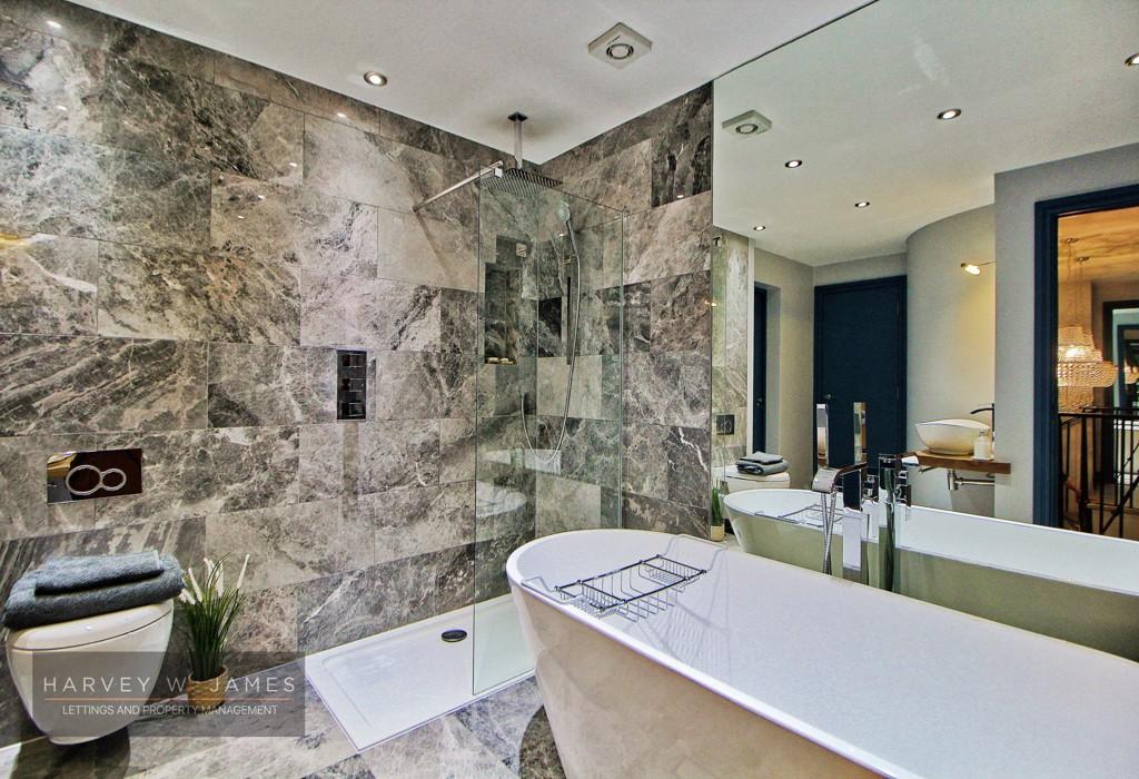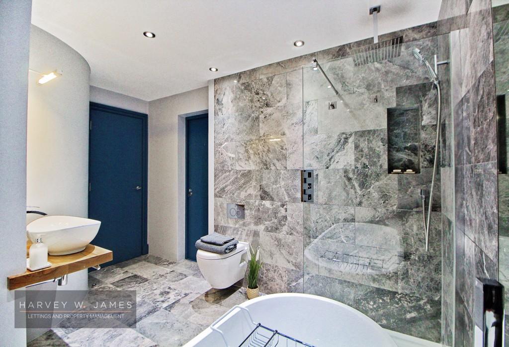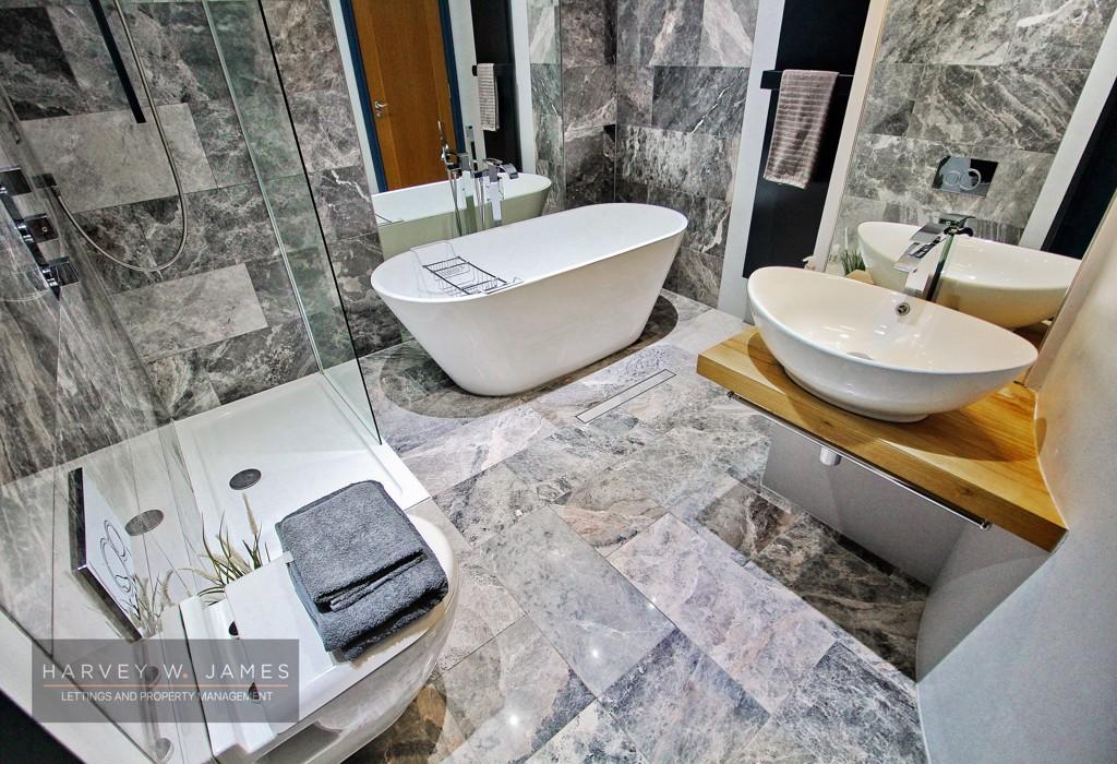 - Bathroom –4.52m (14'10ft) X 2.78m (9’10ft) Large concrete effect porcelain floor tiles, Marble effect wall tiles, Surface mounted basin, overhead shower, hand shower and mixer set, Floor mounted WC with soft-close set and dual-flush control,