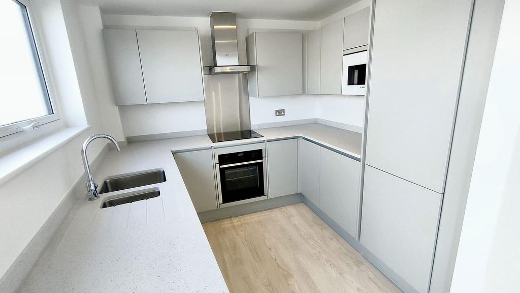 Comfortable living room and fully fitted kitchen with integrated Neff appliances including induction hob, extractor, oven, microwave, fridge/freezer and dishwasher. Door to balcony. Access to both bedrooms, bathroom and utility.