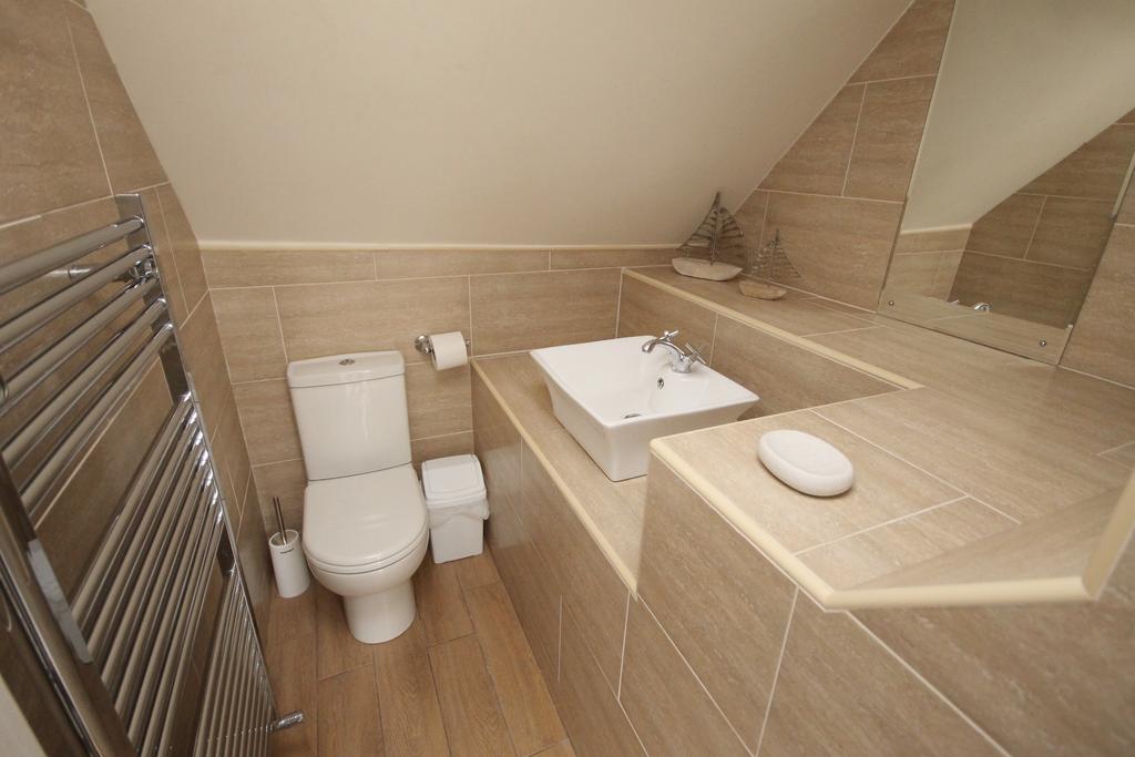 Built in handbasin and wc. Tiled walls. Inset spotlights. Extractor fan. Chrome ladder radiator. Loft access.