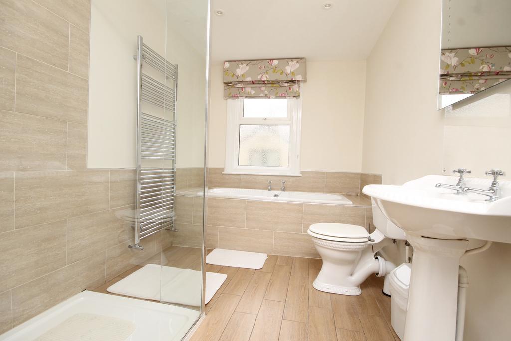 Inset bath. Double shower cubicle with mixer shower. Handbasin and wc. Tiled walls. Extractor fan. Spotlights. Chrome ladder radiator. Upvc double glazed window.