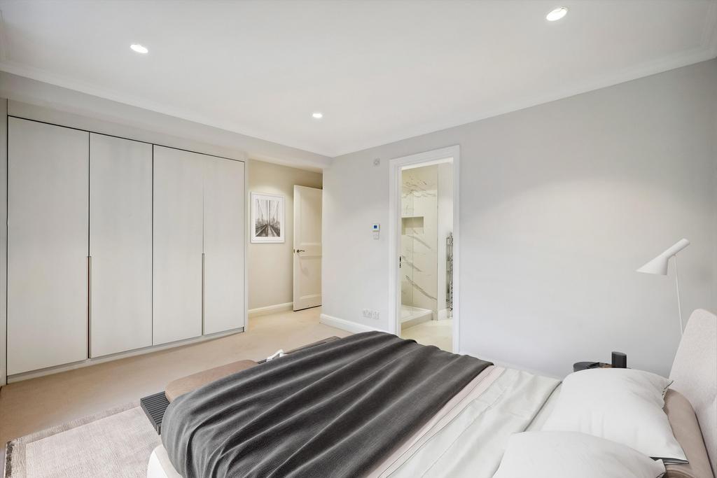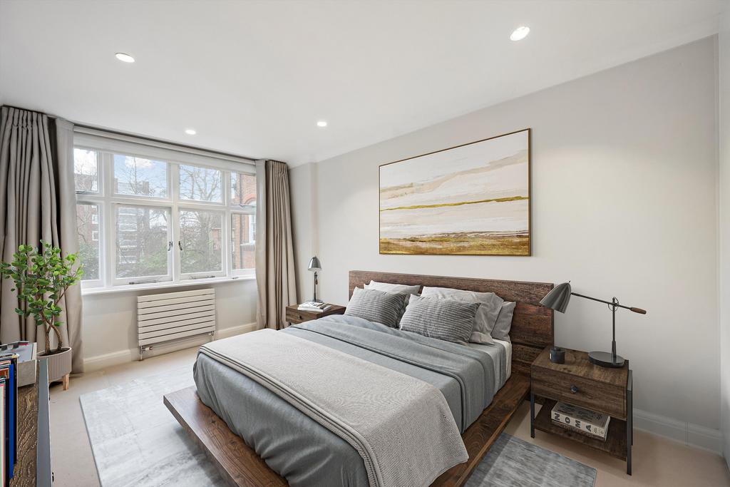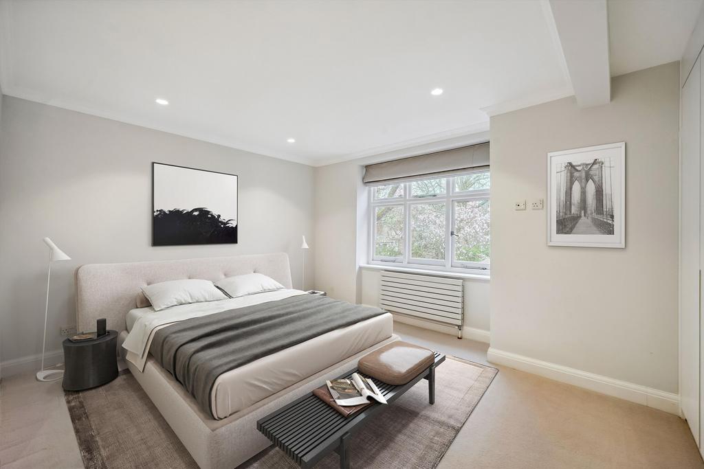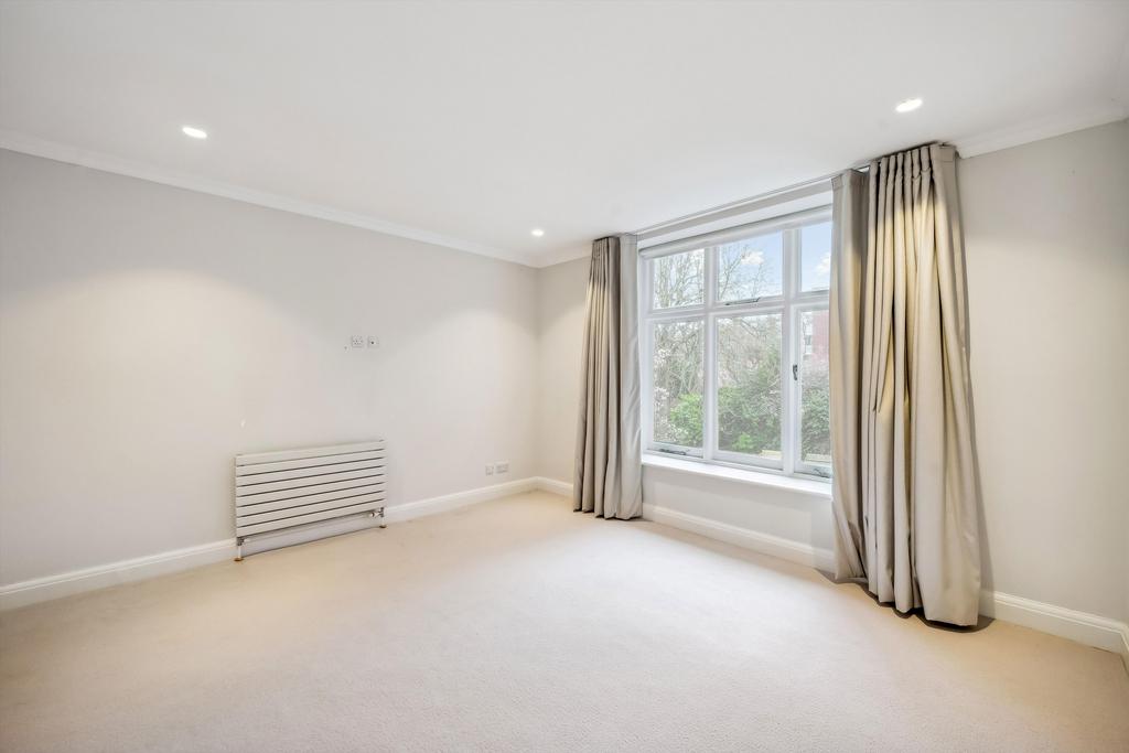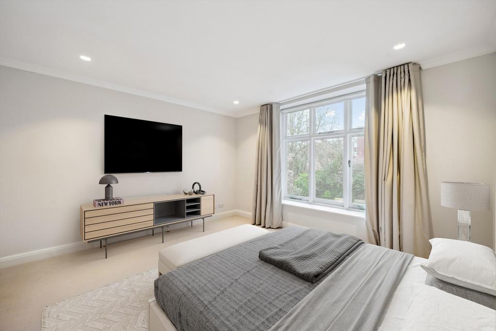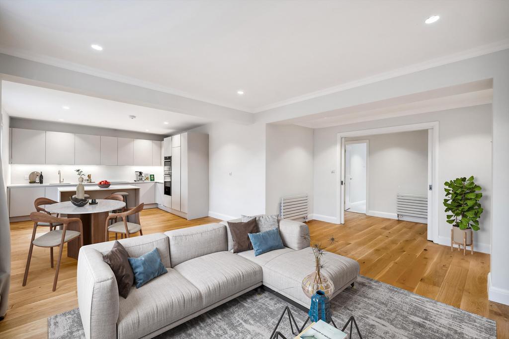 This residence epitomises elegance and tranquillity, featuring a splendid reception room adorned with lofty ceilings and picturesque vistas overlooking serene private communal gardens.