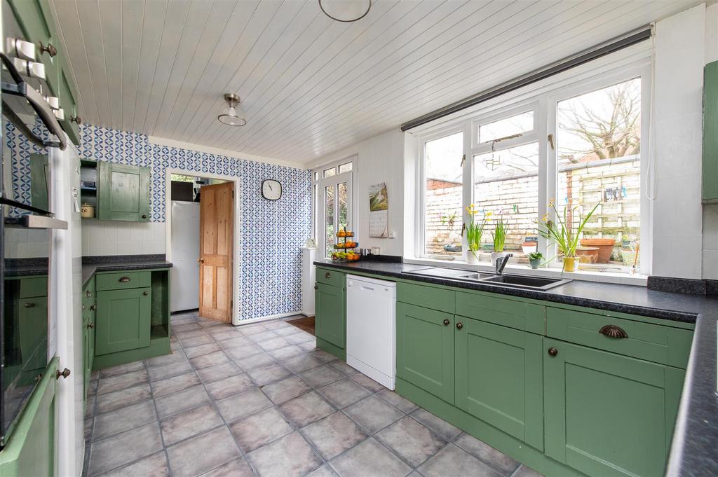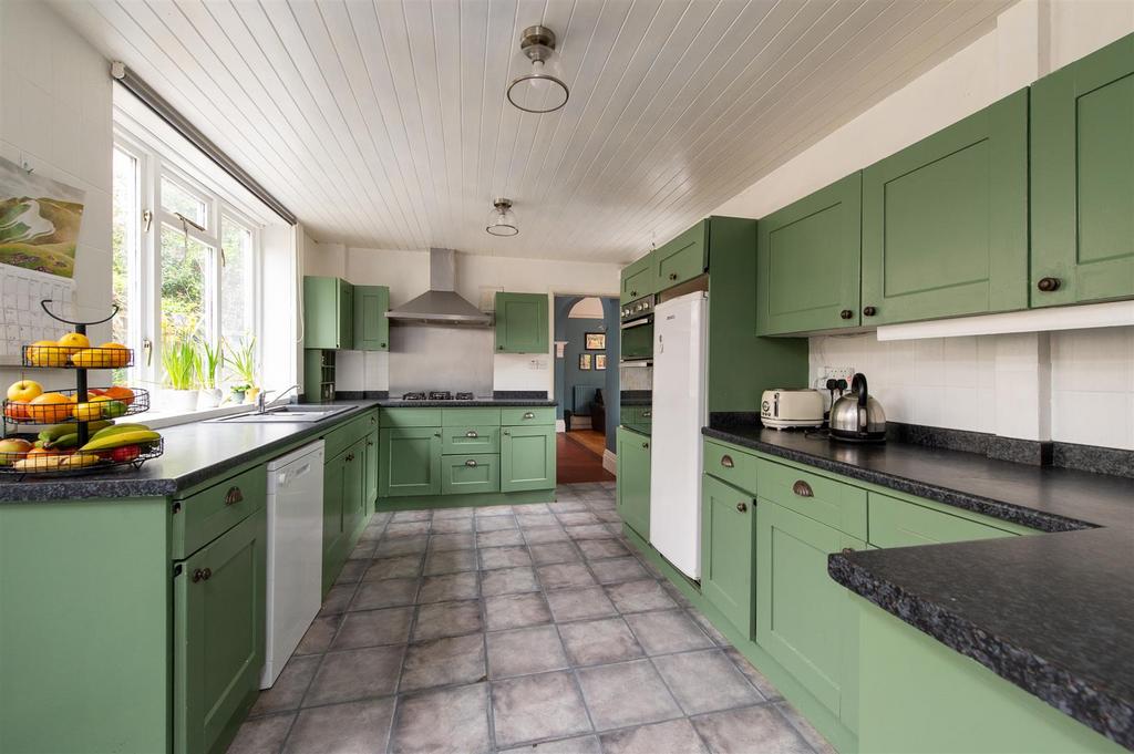 Kitchen - 4.65m x 2.97m (15'3" x 9'8") - Inset sink top with drainer, base units with rolled edge laminate work tops, space for dishwasher, range of wall cupboards, built in double oven, 5 ring gas hob with cooker hood, floor tiles, door to utility area and rear garden, single glazed window, double glazed window and central heating radiator.