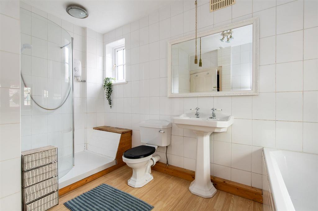 Family Bathroom - Walk in shower with electric shower fitting, separate paneled bath, 'Heritage' pedestal wash hand basin, low flush WC, wall tiles, double glazed window, stained glass window and central heating radiator.