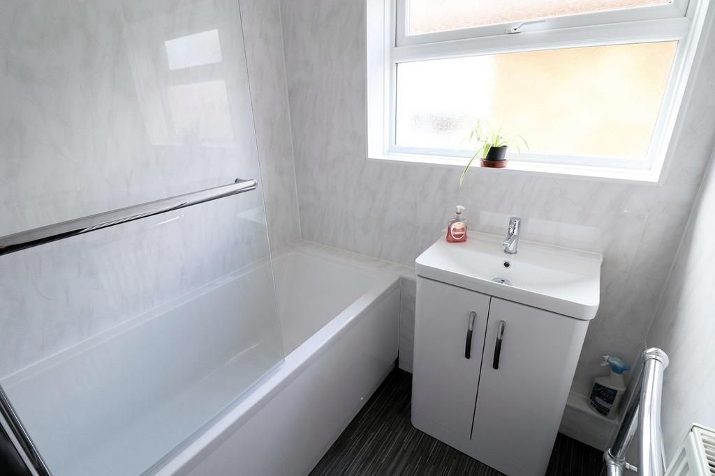 Bath with electric shower over and glass shower screen, wash basin in vanity unit, low level w.c, window to side, radiator, wall mounted electric heater