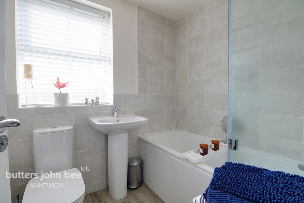 Offering panelled bath with mixer shower and shower screen, pedestal wash hand basin with monobloc mixer tap, low level push button flush wc, heated towel rail and uPVC double glazed window to side elevation.