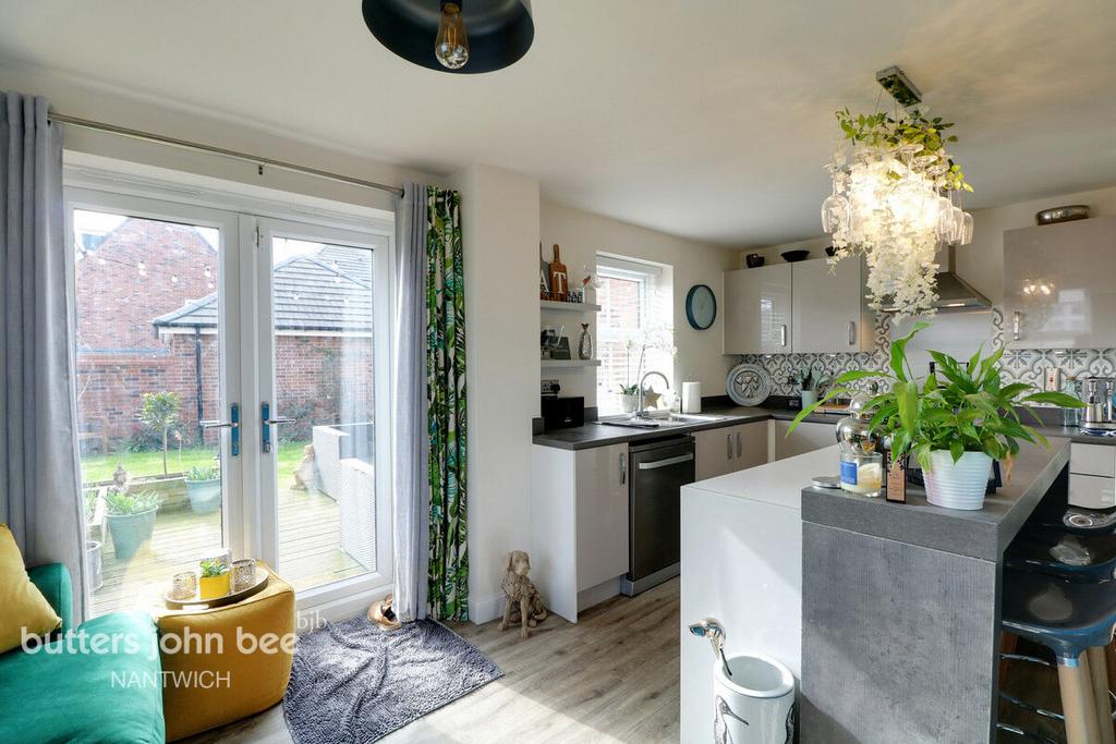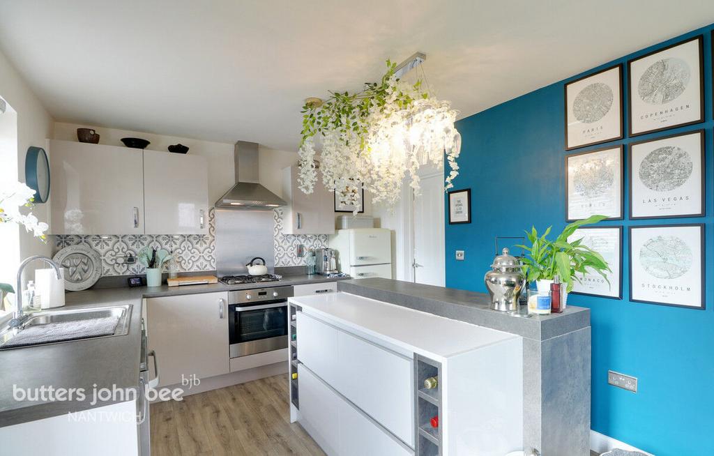 Offering fitted base and wall units, work surfaces, stainless steel sink unit and mixer tap, central island with additional work surface, breakfast bar, deep pan drawer units and wine racks, integral electric oven, four burner gas hob with stainless steel splashback, chimney style cooker hood with lighting, two radiators, uPVC double glazed window to front and side elevations and uPVC double glazed French doors to garden.