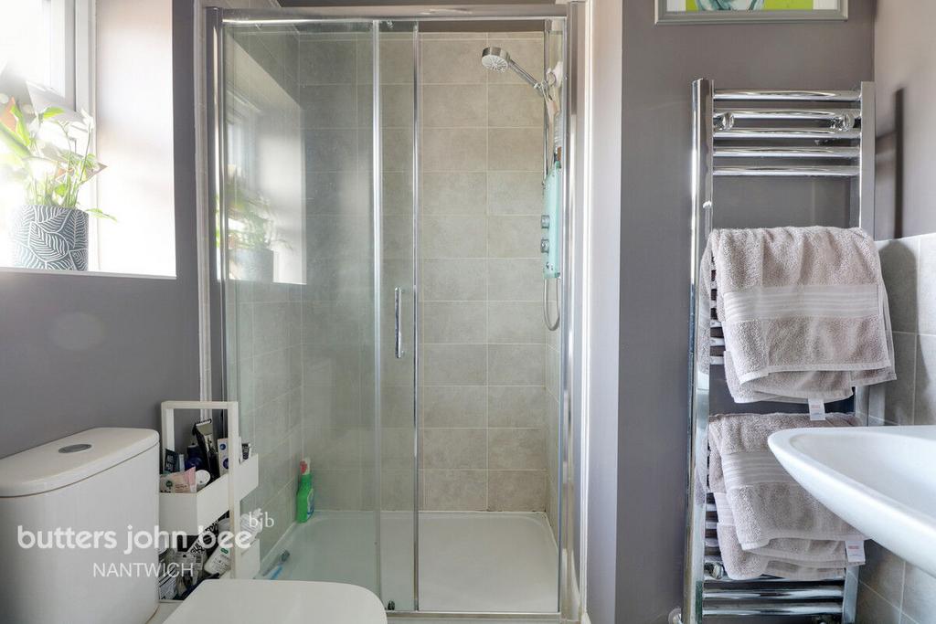 Offering generous size shower cubicle with electric shower unit, pedestal wash hand basin with monobloc mixer tap, low level push button flush wc, heated towel rail, electric shaver point and uPVC double glazed window to front elevation.