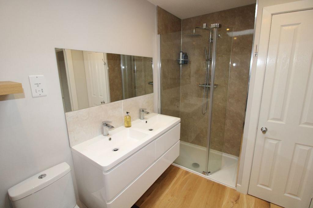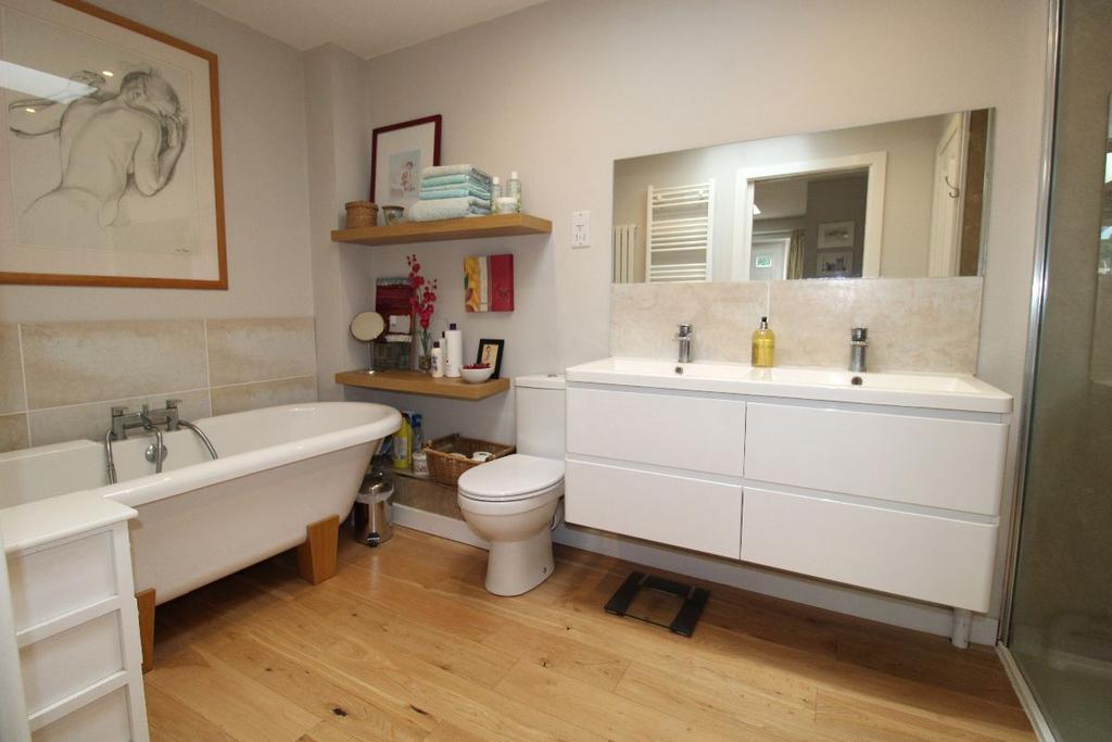 Hi-level Velux window. Engineered oak floor. White contemporary style sanitary ware comprises a low flush WC, twin vanity basins each with pop-up waste monobloc mixers and storage below. Freestanding roll top bath with shower mixer attachment and a glazed screen shower enclosure fitted with monsoon style shower and handset attachment. Extractor fan. Recessed ceiling lights. Vanity mirror. Shaver point. Vertical radiator and ladder style towel rail. Built-in airing cupboard with linen storage shelving.
