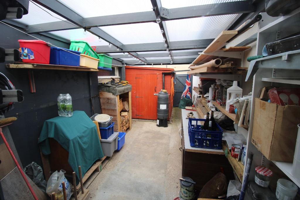 Accessed via a security gate to the side of the property. The carport can be reinstated, but it currently provides undercover storage and is fitted with shelving, along with a timber storage shed with power.