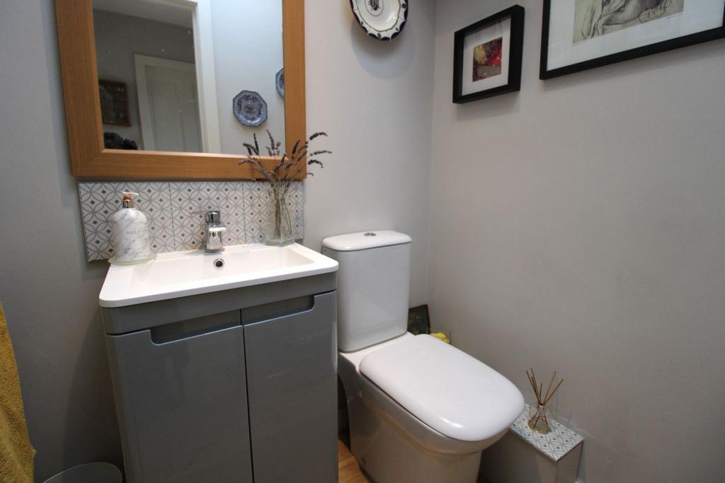White low flush WC, vanity basin with monobloc mixer, pop-up waste and storage below. Engineered oak floor. High-level Velux window. Extractor fan. Recessed lights. Radiator.