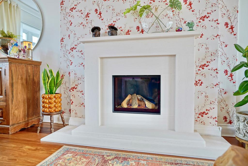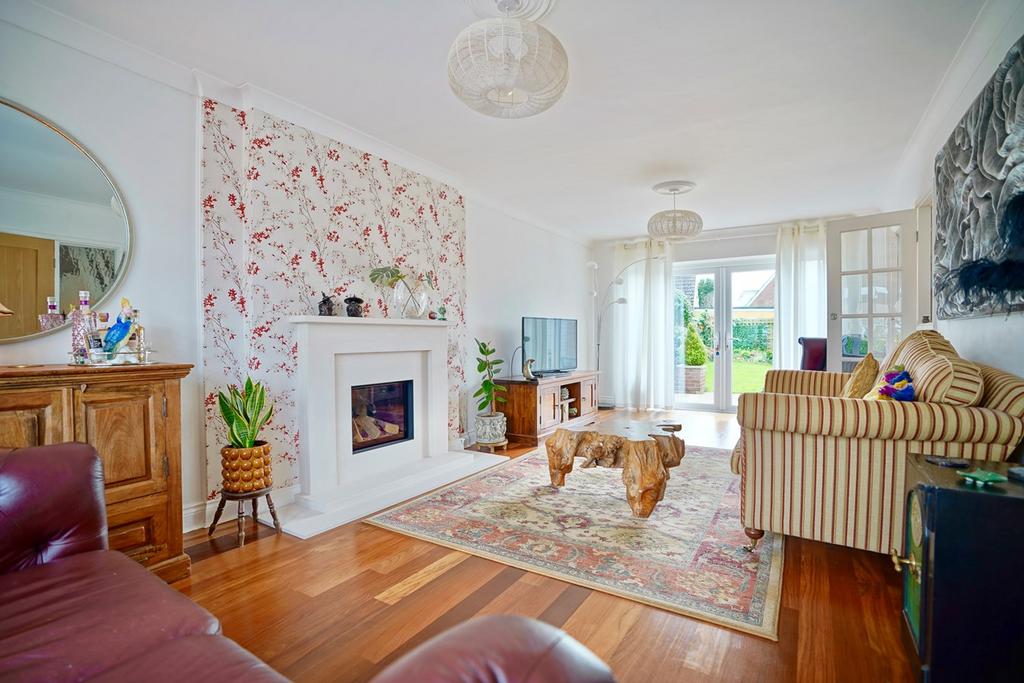 A double aspect room with double glazed bow window to front and double glazed French doors to rear aspect with side windows, coving to ceiling, two ceiling roses, radiator, central stone feature fireplace with inset remote controlled electric fire, solid wood flooring, double internal doors to