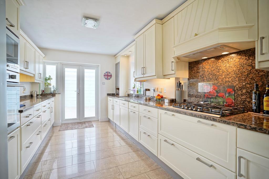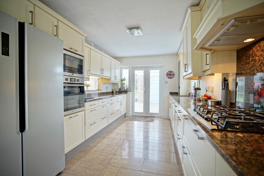 A double aspect room with double glazed window to side aspect and double glazed French doors with fitted blinds and window to rear aspect, fitted in a comprehensive range of base and wall mounted units, drawer units, granite complementing work surfaces and up-stands, under unit lighting, stainless steel single drainer sink unit with mixer tap, integrated electric oven and microwave, gas hob with cooker hood over, space for American style fridge freezer, storage cupboard, ceramic tiled flooring.