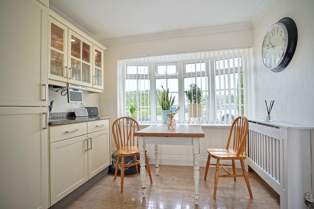 Double glazed bow window to front, coving to ceiling, radiator, base and wall mounted cabinets with integrated TV and granite work surfaces, broom cupboard, tiled flooring.
