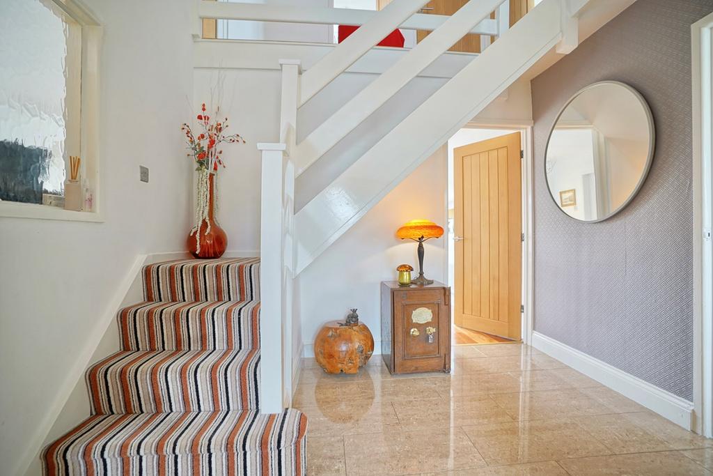 Stairs to first floor, understairs storage recess, cloaks cupboard with hanging and shelving, tiled flooring.