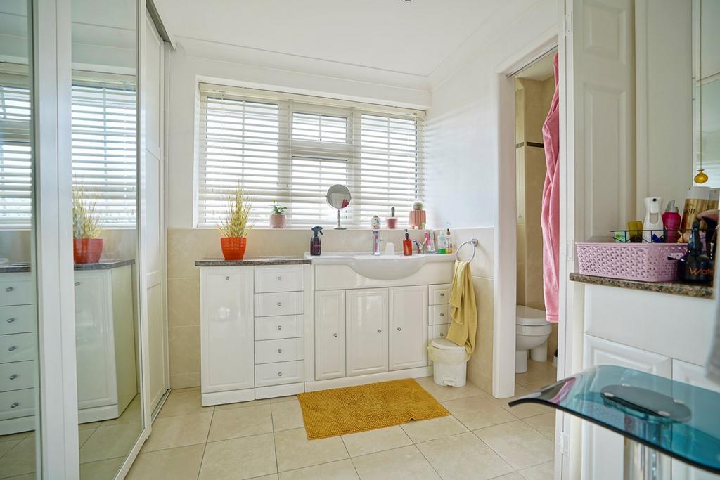 Double glazed window to rear aspect, coving to ceiling, recessed downlighters, built in wardrobes with hanging and shelving, base cupboards with work surface, chrome heated towel rail, tiled flooring, vanity wash hand basin.