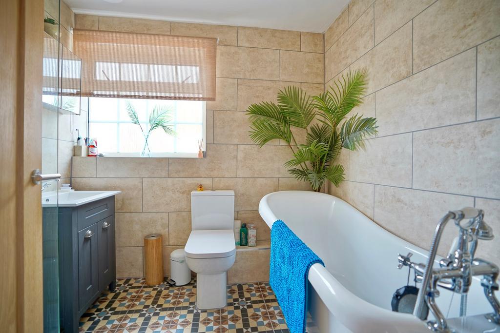 Double glazed window to side aspect, fitted in a four piece suite comprising low level WC, vanity wash hand basin, freestanding roll top bath with mixer tap shower attachment over, double shower enclosure with glazed screen, full ceramic tiling, chrome heated towel rail, tiled flooring.