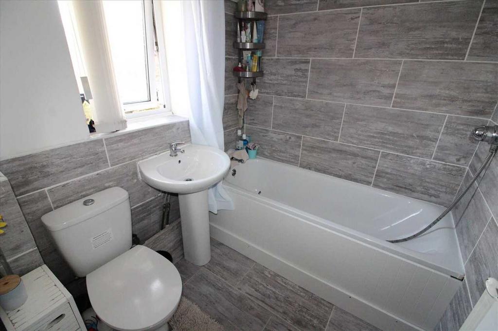 Upvc window to the front of the property, panelled bath with overhead shower, low level Wc and pedestalled wash basin. fully tiled walls and floor.