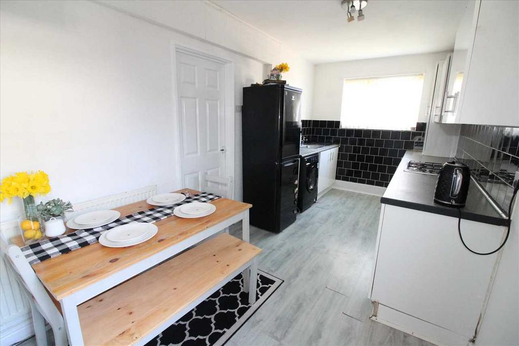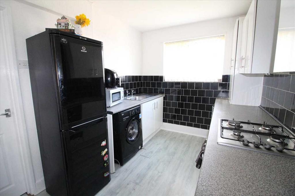 Upvc window and door to the rear, white gloss fitted kitchen with contrasting worktops, integrated oven and hob, plumbed for washing machine, plenty of room for a dining table. The kitchen also houses the Gas combi boiler.