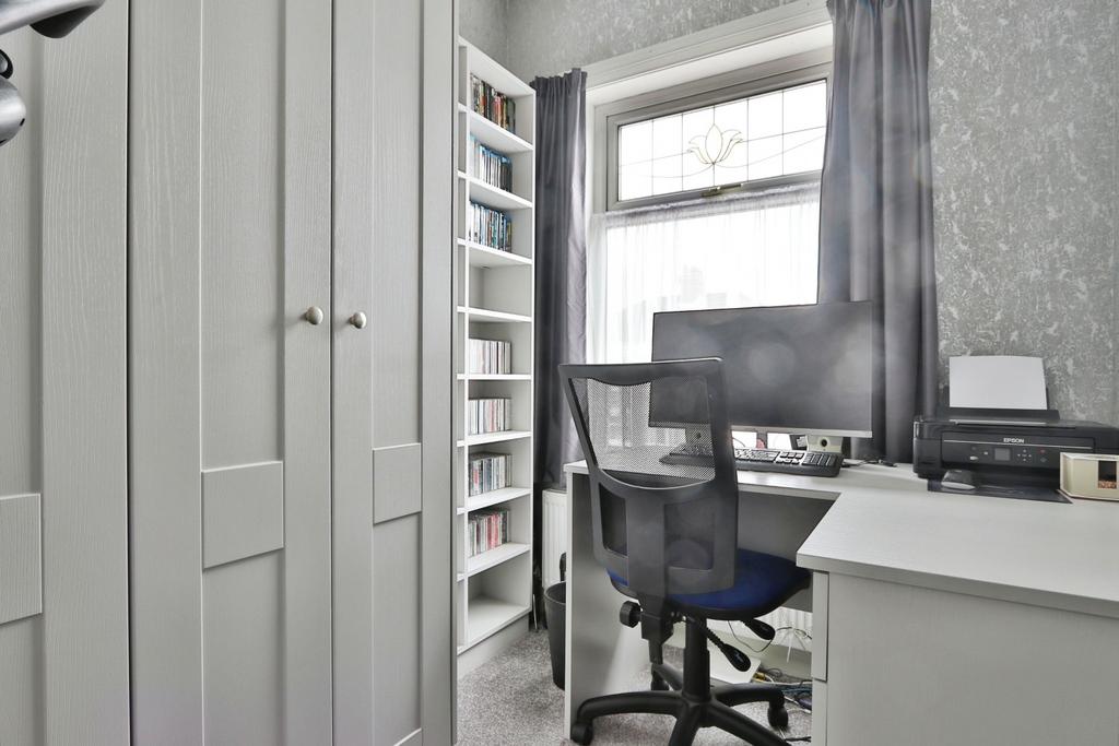 The rear kitchen offers ample storage with its generous wall and base units, and every nook is thoughtfully utilised, with a convenient pantry tucked into the lobby. Upstairs, the bedrooms invite rest and relaxation. The sizable master bedroom, with its extensive fitted wardrobes and generous bay window, offers a quiet escape. The second bedroom peers over the rear garden and shares the same attention to storage, whilst the third bedroom, currently designed as a stylish office space, can serve as a cosy guest room.