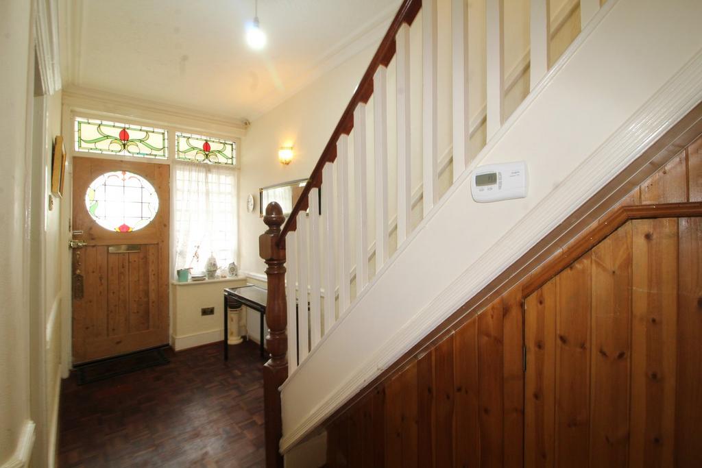 Stained glass picture windows, radiator, dado rail, ornate cornice, understairs cupboard housing meters, power points, finger block flooring, stairs with fitted carpet and balustrade to first floor landing, original panel doors to: