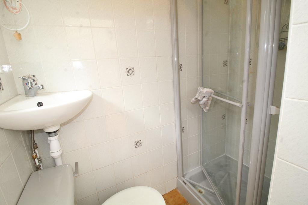 Frosted casement window, fully tiled walls, shower cubicle with electric shower, wall mounted wash hand basin with mixer tap, low flush wc, ceramic tiled floor.