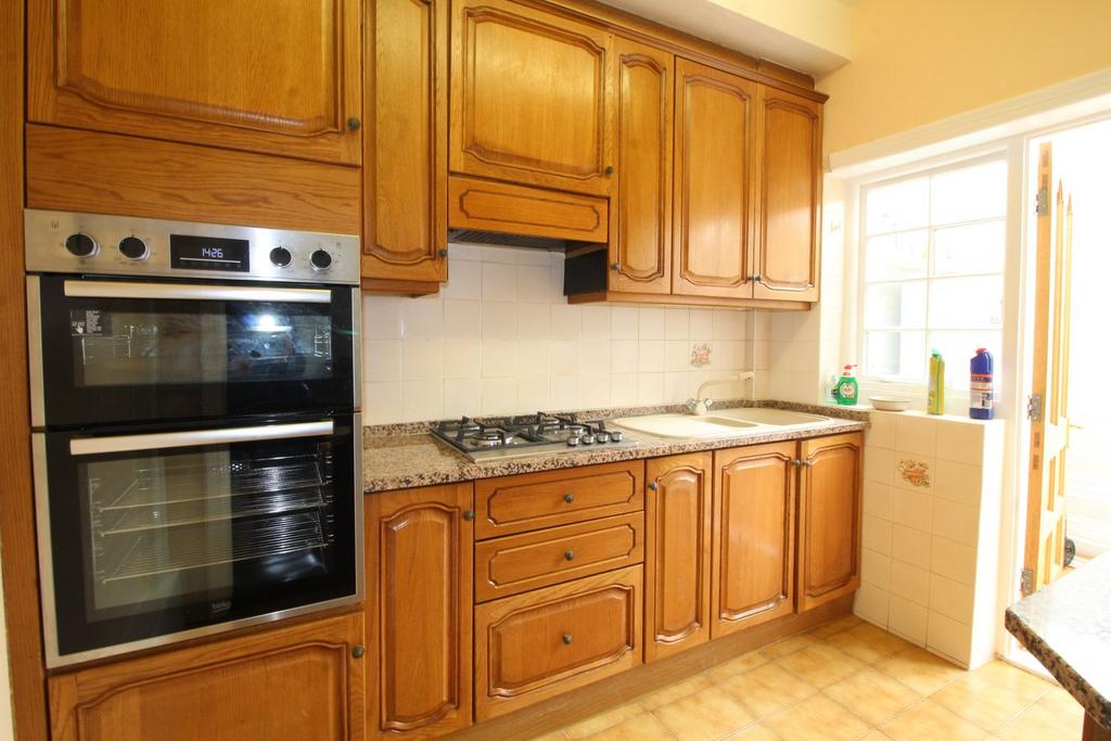 Casement window to rear, plenty of matching fitted wall and base units with laminate worktops housing single drainer one and a half bowl sink unit with mixer tap and tiled splashback, stainless steel double oven, stainless steel gas hob, concealed cooker hood, power points, ceramic tiled floor, part glazed door to: