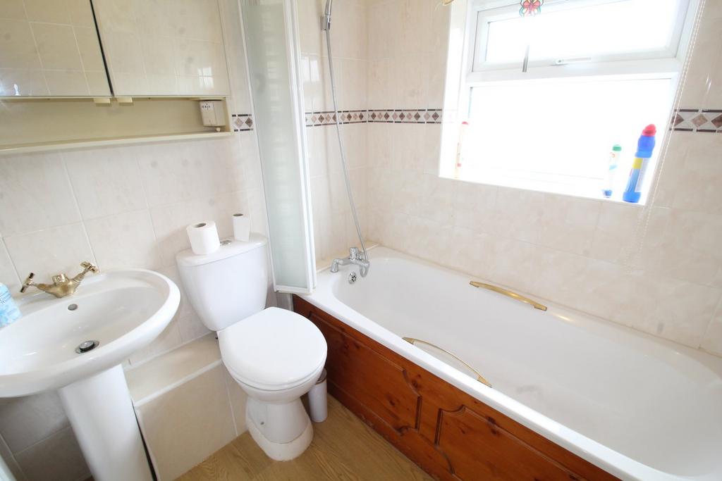 Frosted double glazed casement window to rear, fully tiled walls, radiator matching white suite comprising panel bath with mixer tap, shower attachment and folding shower screen, pedestal wash hand basin with mixer tap and mirrored medicine cabinet above, dual flush wc, air extractor, vinyl flooring.